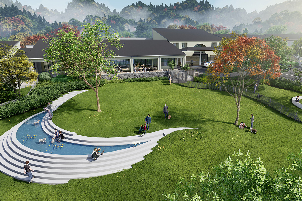 ホテルのコンセプトは、自然と建物が調和することで、愛犬にも人にも居心地の良い環境を目指すという考えのもと「RETURN TO NATURE(自然への回帰)」に決定しました。“RETONA HAKONE”の特長は、箱根の自然を生かした景観と、自然を感じさせる素材を取り入れた空間づくり。屋外には約2,200㎡と関東最大級の規模を誇る天然芝のドッグパーク、森での散歩気分を味わえる約2,000㎡のドッグガーデンがあり、愛犬が自然に囲まれた広大な敷地内を自由に駆け回ることができます。
