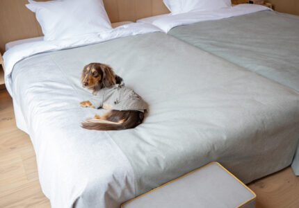 快適にお過ごしいただくために日用品をはじめ愛犬用のベッドやトイレはもちろん、一緒に眠る時に愛犬がベッドに乗るための「ベッドステップ」、館内の移動に便利な「ペットカート」などのご用意もあります。ご家族と同じ生地を使った愛犬用の館内着もサイズ別に用意し、お揃いの館内着を着てお過ごしいただけます。