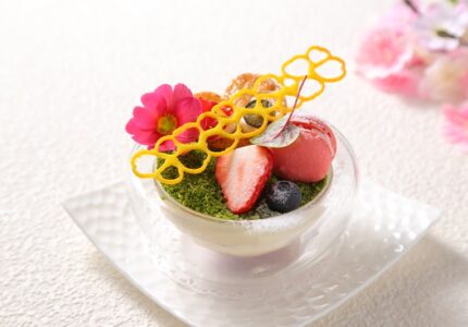 庭園に面したホテル本館1階ラウンジでは、ホテルの庭園をイメージしたティラミス「ジャルダン」を提供します。コクのあるマスカルポーネに、甘酸っぱいベリーと抹茶クランチがアクセント。パイや苺のマカロン、ツツジを模したチュイルで華やかに仕上げました。ツツジが咲き誇る庭園を眺めながら、目と舌で楽しめる一品です。