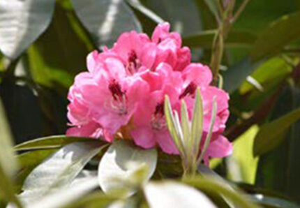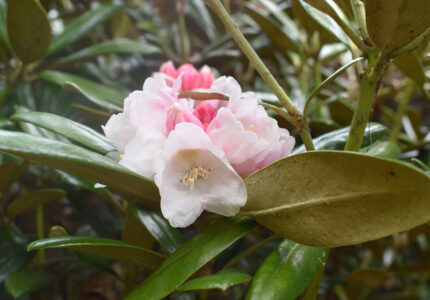 「ヤクシマシャクナゲ」日本原産の野生種。屋久島(鹿児島県)の固有種で、蕾は濃いピンクだが、開花すると白色になる。