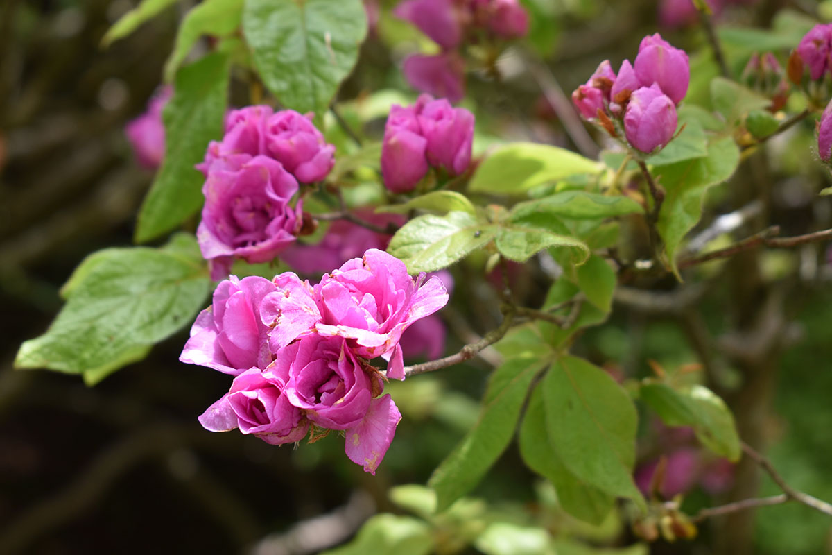 「手牡丹(てぼたん)」江戸時代の園芸書にも登場するツツジの古品種。紅紫色の八重咲きで、雄しべが花弁に変異した珍しい花姿が特徴。露地植えで残る株は少ない貴重品種で、ホテル庭園で1株のみ見ることができる。 -