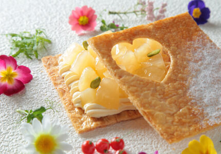 目玉となるのは、フランスの伝統菓子ミルフィーユを現代風にアレンジした、片手で楽しめる新感覚のデザートです。店内で焼き上げるサクサクのパイ生地と、シャキシャキとした食感を活かしたリンゴのコンポートが織りなす、芳醇な香りと味わいをお楽しみいただけます。