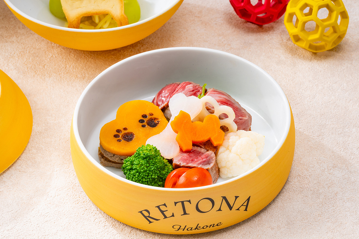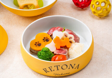 また、“RETONA HAKONE”では、愛犬家のガストロノミーにも着目。レストラン内は湾曲する壁によって緩やかなプライベートスペースが確保され、それぞれの席で愛犬と一緒に食事を愉しむことができます。夕食は、日本料理を和食の伝統と現代の多様な食文化を調和させて表現する「モダン懐石」を用意。自家製塩麹などの発酵食材を取り入れた身体にうれしい料理や食後のデザートにまでこだわった、特別なディナータイムを提供します。