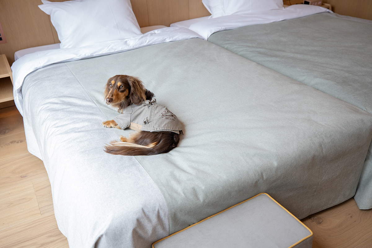快適にお過ごしいただくために日用品をはじめ愛犬用のベッドやトイレはもちろん、一緒に眠る時に愛犬がベッドに乗るための「ベッドステップ」、館内の移動に便利な「ペットカート」などのご用意もあります。ご家族と同じ生地を使った愛犬用の館内着もサイズ別に用意し、お揃いの館内着を着てお過ごしいただけます。