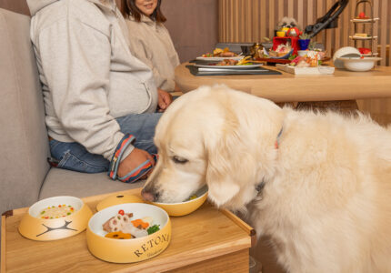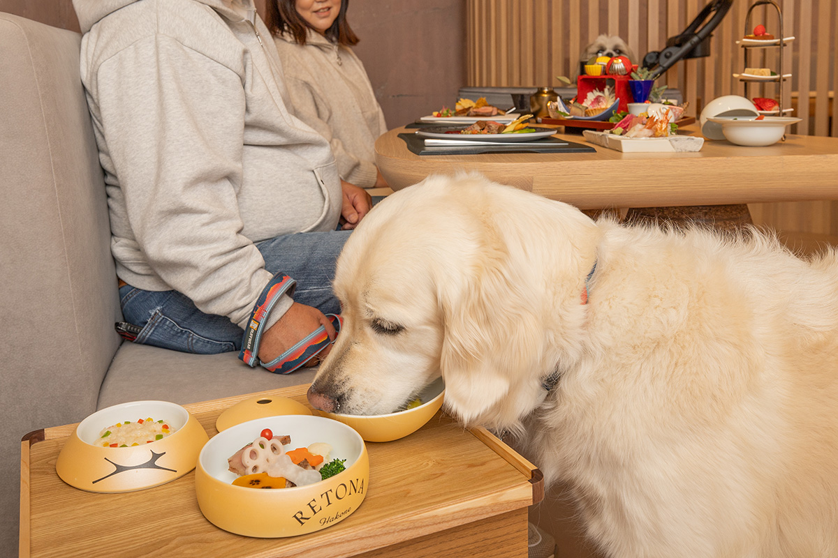 館内1階のダイニングでは、愛犬とともに夕食・朝食をお楽しみいただけます。半個室も配置され、ご家族で気兼ねないプラベートな食事時間を過ごせます。“RETONA HAKONE”では愛犬家のガストロノミーにも着目し、上質な食材とハイクオリティな料理を提供します。ご家族用の夕食は、日本料理を現代的なコース仕立てで風味豊かに表現する「モダン懐石」をご用意。「RETURN TO NATURE(自然への回帰)」をテーマに、地産地消の食材、自家製塩麹など自然由来の発酵食材を取り入れています。愛犬用のお食事は全てペット栄養管理士の資格を持つ料理長監修のオリジナルメニューです。