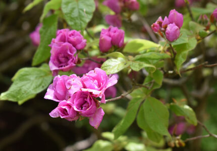 「手牡丹(てぼたん)」江戸時代の園芸書にも登場するツツジの古品種。紅紫色の八重咲きで、雄しべが花弁に変異した珍しい花姿が特徴。露地植えで残る株は少ない貴重品種で、ホテル庭園で1株のみ見ることができる。 -