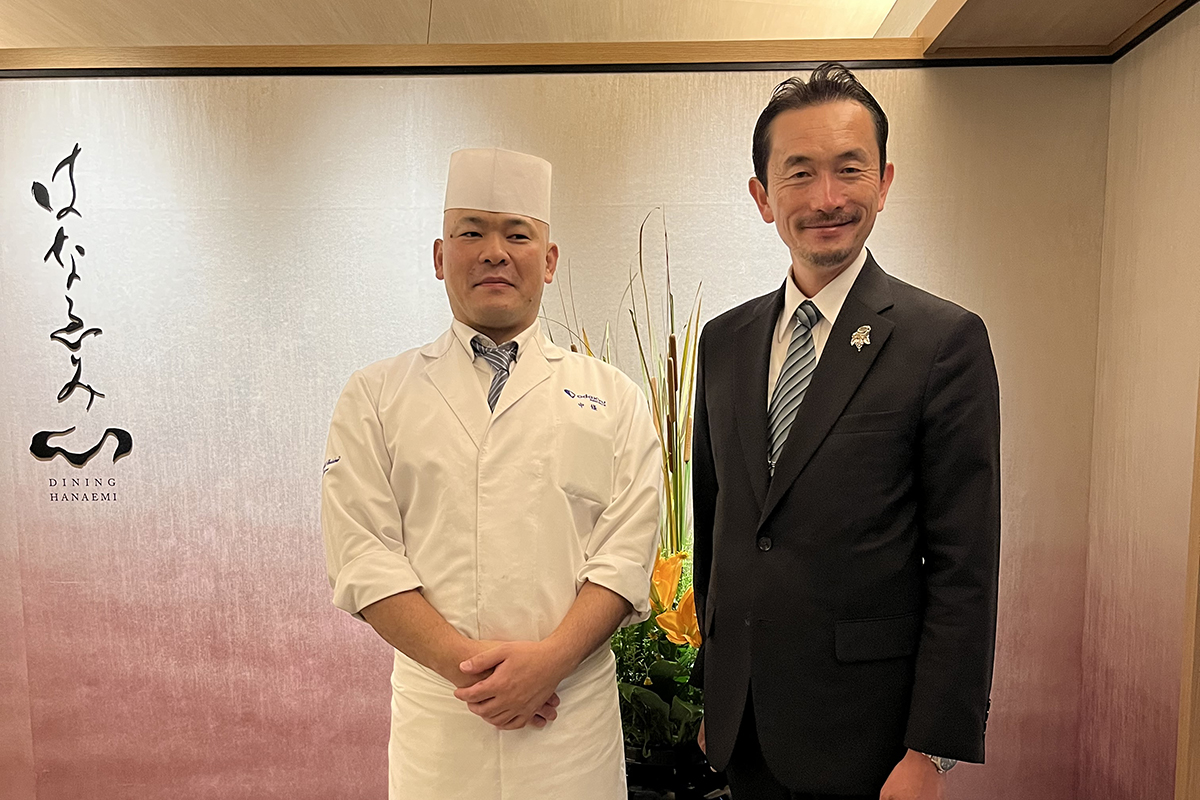 - ①ロビーラウンジにて平川氏および“はつはな”料理長・中條による挨拶、アペリティフのご提供