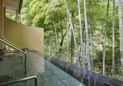 “まほろみ”では、施術の前後に温泉に入ることで、一夜で湯治を終えたかのような状態に心身を導き、温泉の力をまるごと堪能できる身体に還す「湯治セラピー」をオリジナルメソッドとしています。客室内の露天温泉や貸切風呂(事前予約制)で箱根に流れる涼風を浴び、木々のさざめきなどに耳を澄ませば、深緑に包まれた箱根の豊かな自然風景とリラクゼーションによる癒しをより堪能することができます。